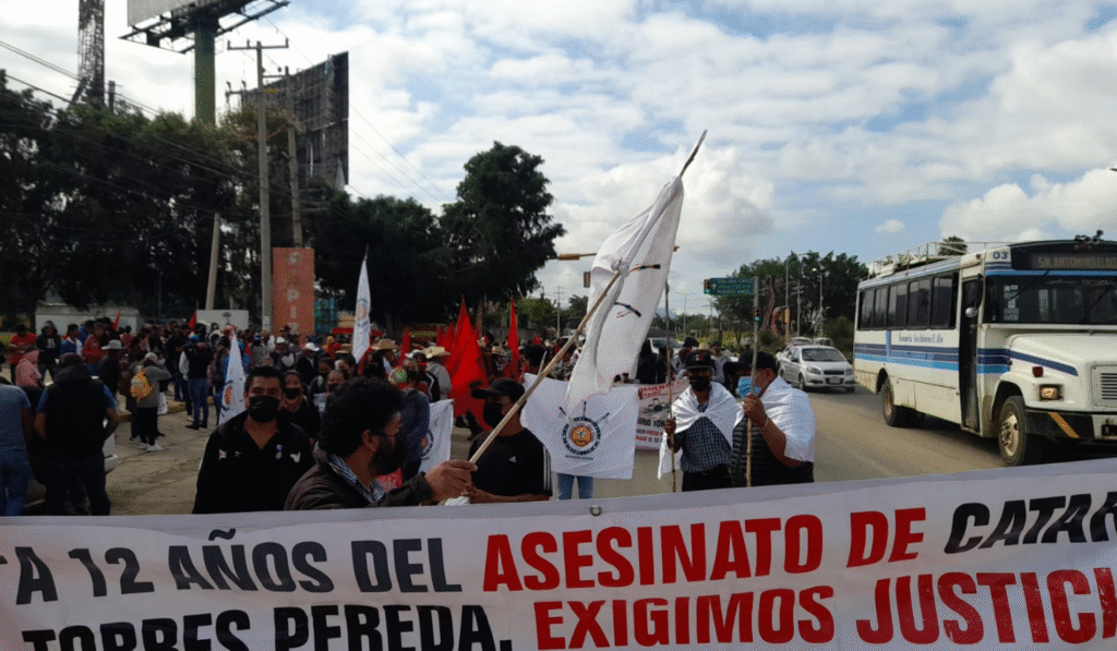 Doce años después del asesinato del líder social Catarino Torres Pereda, integrantes de la Asamblea de los Pueblos en Defensa del Territorio, la Educación y los Derechos Humanos salieron nuevamente a las calles de Oaxaca de Juárez para exigir justicia y castigo a los responsables intelectuales del crimen, ocurrido el 22 de octubre de 2010 en Tuxtepec.