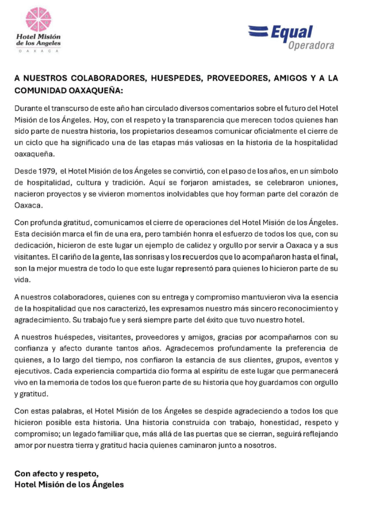 En su mensaje de despedida, la operadora del hotel destacó que este cierre “marca el fin de una era”, pero también honra el trabajo de todas las personas que hicieron posible su historia. El comunicado expresó un agradecimiento especial a sus colaboradores, quienes durante décadas mantuvieron viva la esencia de la hospitalidad oaxaqueña con compromiso y calidez.