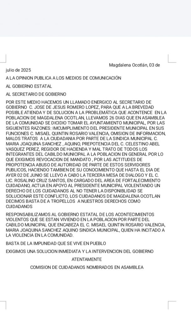 De acuerdo con un documento firmado por la Comisión de Ciudadanos Nombrados en Asamblea, los inconformes denuncian violencia verbal y física por parte de las autoridades municipales, lo que ha provocado un ambiente de tensión permanente en la localidad.