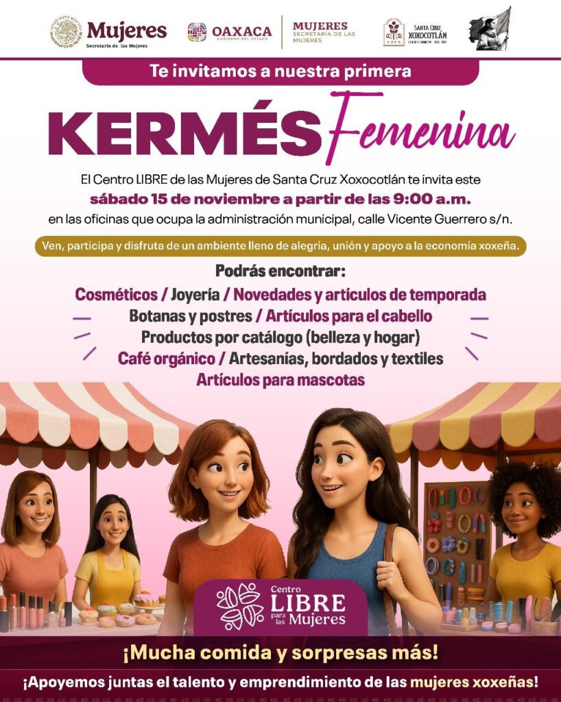 Santa Cruz Xoxocotlán se prepara para un fin de semana lleno de color, unión y emprendimiento. Este sábado 15 de noviembre, el Centro LIBRE de las Mujeres de Xoxocotlán, con el respaldo del Ayuntamiento, celebrará la Primera Kermés Femenina, una iniciativa que busca fortalecer la economía local y visibilizar el trabajo de las mujeres emprendedoras del municipio.