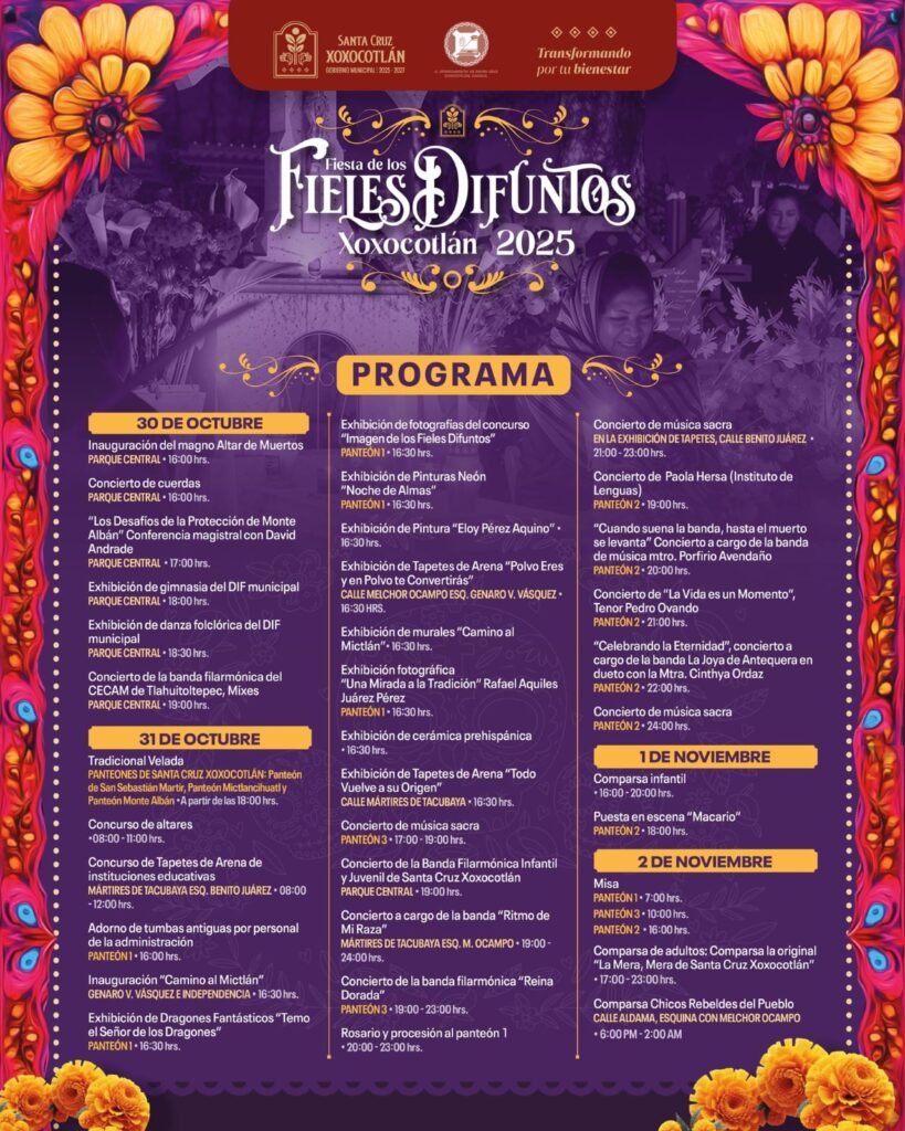 Del 30 de octubre al 2 de noviembre, Santa Cruz Xoxocotlán se prepara para vivir una de las celebraciones más emblemáticas y esperadas del año: la Fiesta de los Fieles Difuntos 2025. Este evento reúne tradición, arte, música y memoria colectiva en más de 30 actividades culturales que transforman las calles y panteones del municipio en un espacio lleno de luz y color.